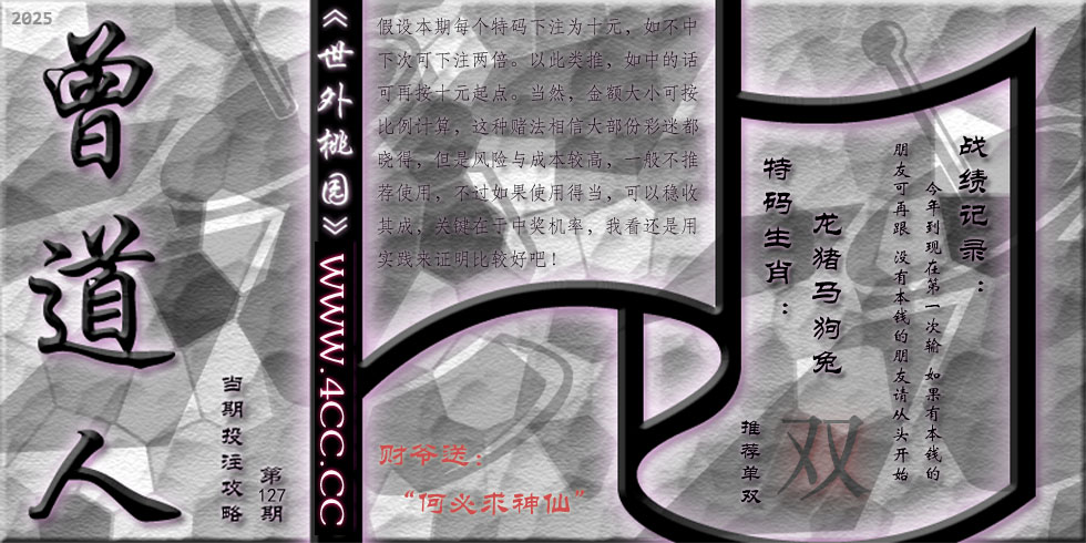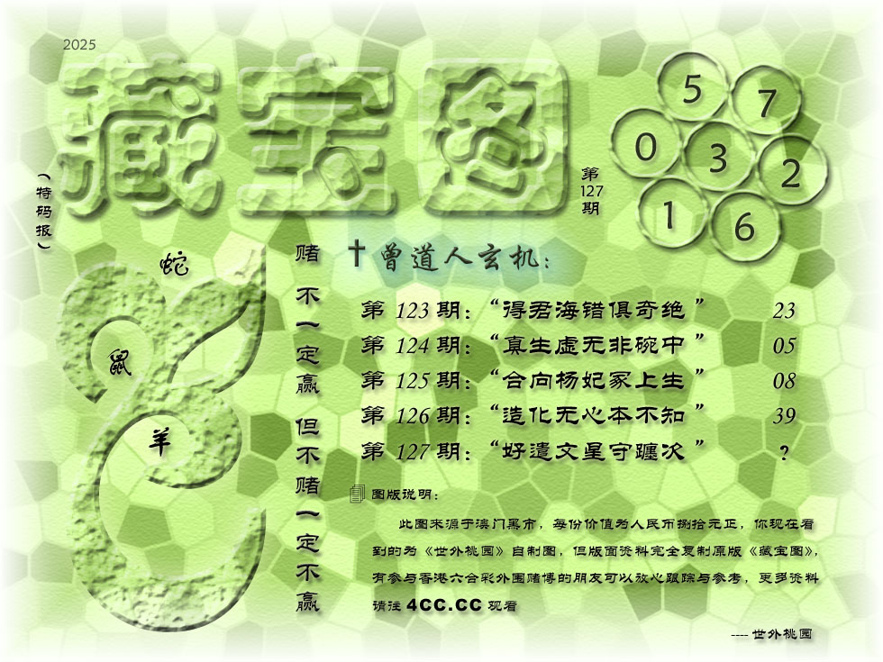 127期藏寶圖 新:好遣文星守躔次 老:毒虬相视振金环 禁:猴 禁:8尾 玄機字:《竺》财爷送:“何必求神仙” |